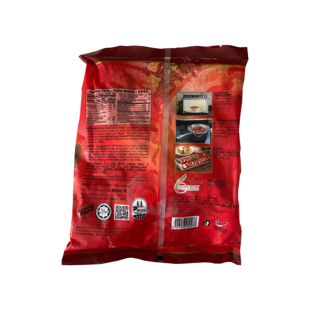 Ingredients: Wheat Gluten, Filtered Water, Sugar, Salt, Roasted Rice, Vegetarian Seasoning, Soy Sauce Powder
